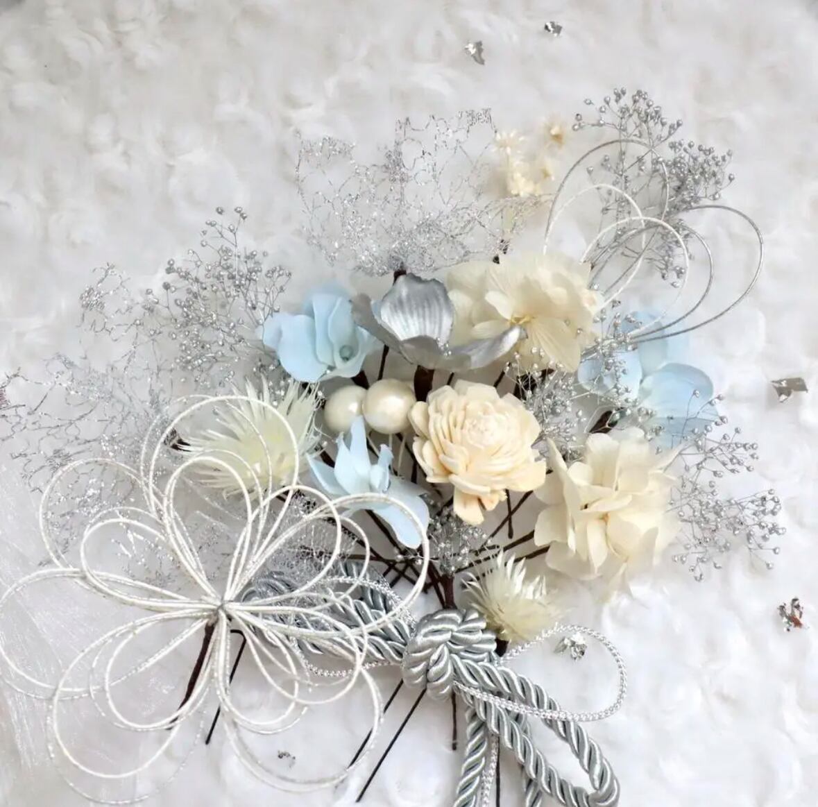 成人式髪飾り 成人式 髪飾り 水引のお花 白×水色ヘアセット ブルー 成人式 卒業式 髪飾り パール 【銀箔シート、パールガーランド付き】 成人式髪飾り くすみ 水色