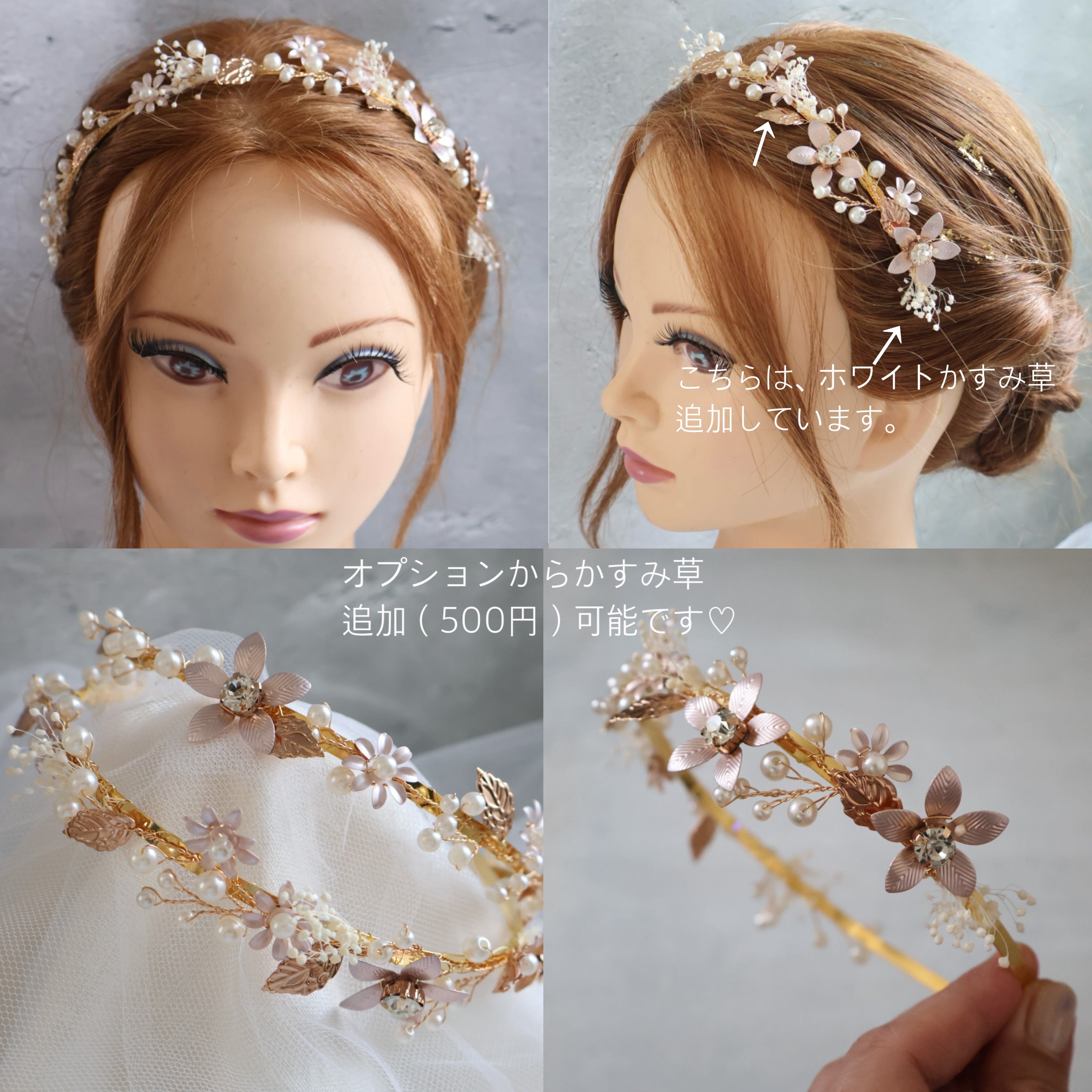 お花の部分を避け、ワイヤーの部分をお持ち頂き、ヘアパーツを差し込んでご使用下さい。ワイヤー部分は曲げて調整可能です。